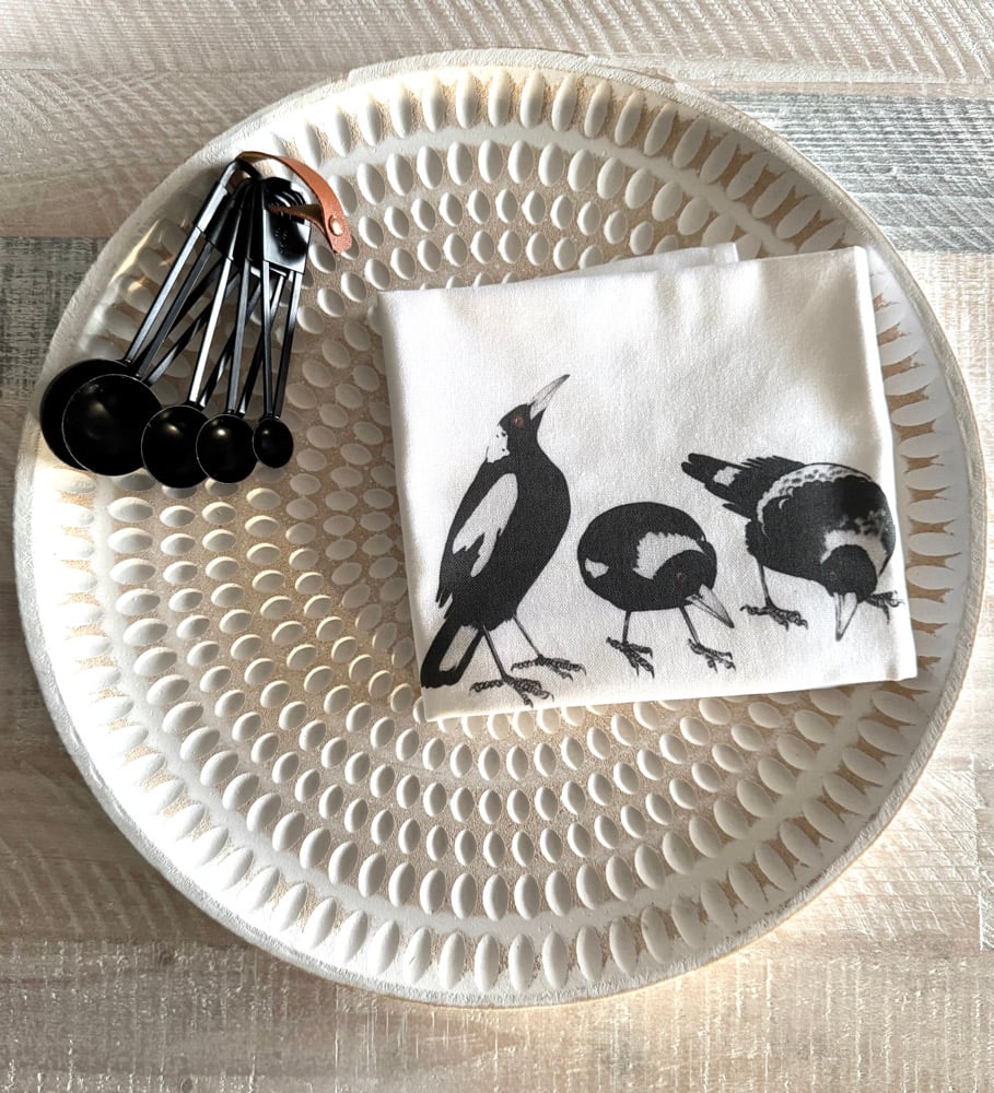 Bring a touch of Australiana into your home. The Magpie Tea Towel features a hand-drawn magpie design, printed in Tin Can Bay. Perfect for adding charm to your kitchen or as a thoughtful gift, it pairs beautifully with our Magpie Cards and Gift Tags.